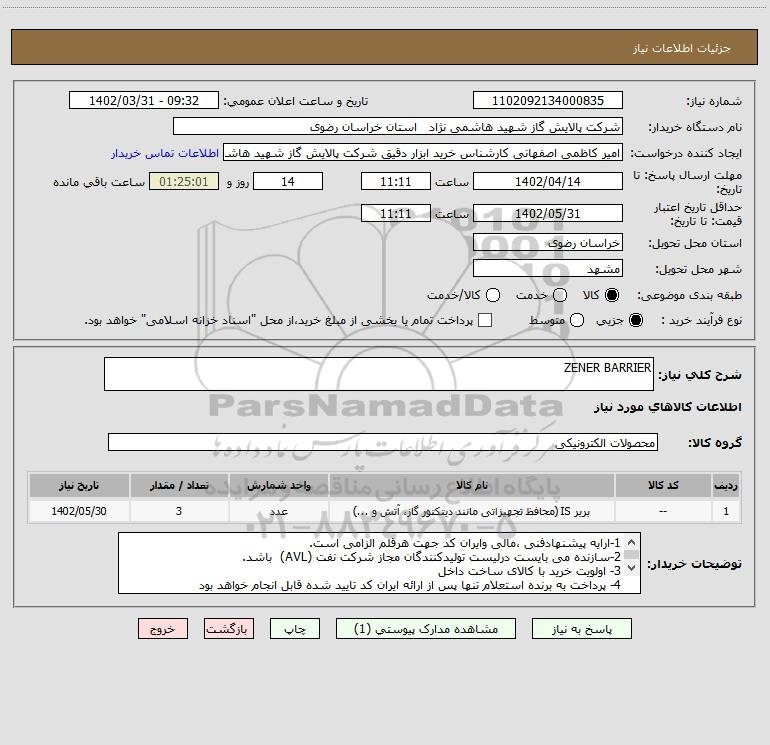 نام دستگاه خریدار:شرکت پالایش گاز شهید هاشمی نژاد استان خراسان رضوی