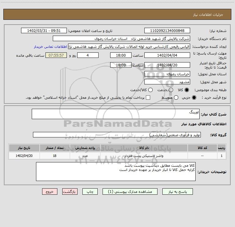 نام دستگاه خریدار:شرکت پالایش گاز شهید هاشمی نژاد استان خراسان رضوی