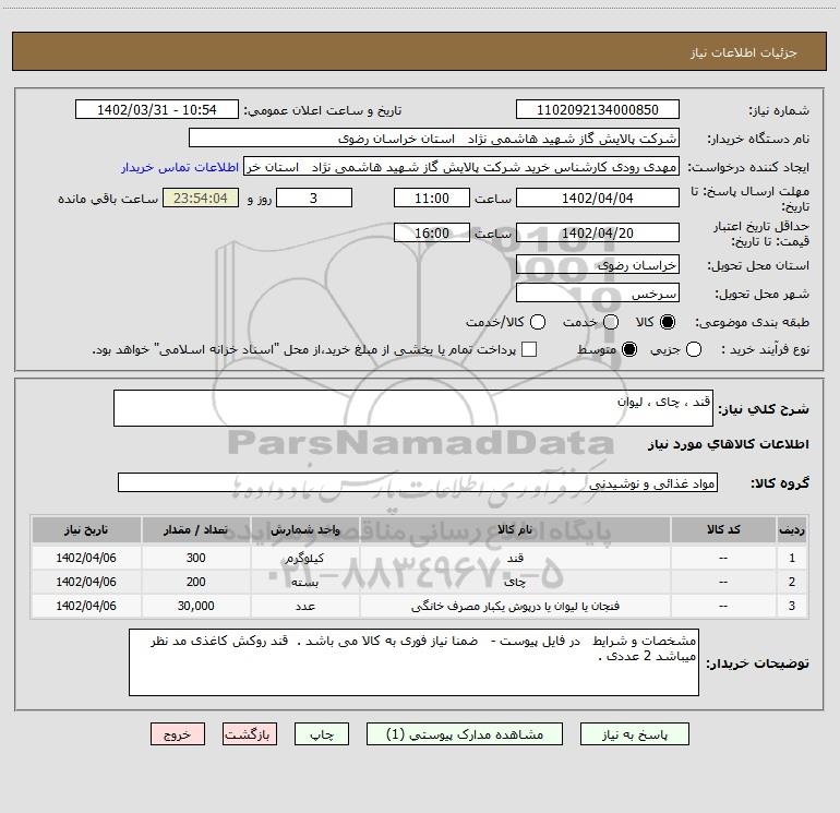 نام دستگاه خریدار:شرکت پالایش گاز شهید هاشمی نژاد استان خراسان رضوی