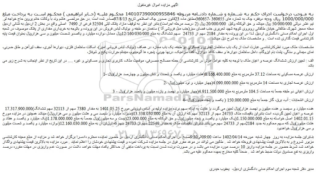 به موجب درخواست اجرای حکم به شماره و شماره دادنامه مربوطه 140107390000955846 محکوم علیه (جابر ابراهیمی ) محکوم است به پرداخت مبلغ 1000/000/000 ریال وجه دوفقره چک به شماره های 360655 ،360657مطابق ماده 23قانون صدور چک اصلاحی تاریخ 97/8/13صادر شده است .در حق مرتضی هاشم وند با وکالت خانم پروین حاج خواجه لو. نیم عشر دولتی 50/000/000 ریال میباشد و حق الوکاله وکیل 20/000/000 ریال (2 درصد مرحله اجراست).بنابر این نظر به توقیف مازاد پلاک ثبتی 32504 فرعی از 7490 اصلی واقع در بخش 2 اردبیل به نشانی اردبیل محله معجز شهرک طالقانی خیابان طالقانی روبروی کوچه شهید تحریری جنب فضای سبز(جنب مبل فروشی آتا ) ساخمان دو طبقه و بوتیک لباس فروش در این پرونده و باتوجه به خریداری مقداری از پلاک موصوف در شعبه اول اجرای احکام مدنی دادگستری اردبیل لذا در این پرونده به مقدار 2184 سهم از 24733 سهم ششدانگ به مبلغ 12/160/030/000ریال معادل دوازده میلیارد و یکصدو شصت میلیون و سی هزارریال بعنوان قیمت پایه کارشناسی قیمت گذاری شده است . و مشخصات ملک به شرح ذیل میباشد .