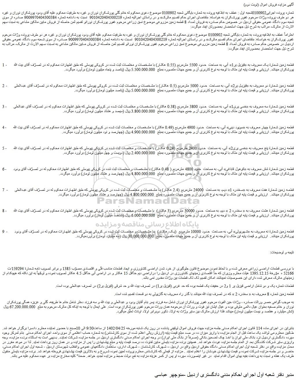 شماره پرونده اجرایی0100902شعبه اول : عطف به ابلاغیه پرونده به شماره بایگانی شعبه 0100902 موضوع دعوی محکوم له خانم گلی پورشکران نوران و غیره به طرفیت محکوم علیه آقای ودود پورشکران نوران و غیره هر دو طرف پرونده ورّاث مرحوم غفور پورشکران به خواسته: «تقاضای اجرای حکم تقسیم ماترک» و در راستای اجرائیه شماره 9010420404300219  نسبت به دادنامه شماره 9009970404300384 صادره از سوی شعبه سوم دادگاه عمومی حقوقی اردبیل در خصوص حکم صادره به فروش تعداد 8 قطعه زمین مزروعی موضوع نسق زراعی مرحوم غفور پورشکران نورانو تقسیم ثمن حاصله از فروش مابین مالکین مشاعی به نسبت سهم الارث از ماترک، مراتب به شرح ذیل جهت استحضار بحضورتان ایفاد میگردد: