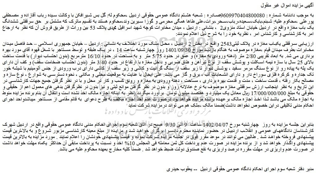 8 مزایده ملک 9810688 1404/08/15 new not special not payed اردبیل