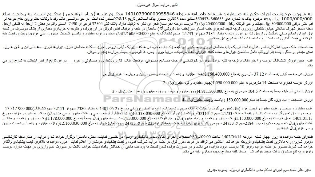 به موجب درخواست اجرای حکم به شماره و شماره دادنامه مربوطه 140107390000955846 محکوم علیه (جابر ابراهیمی ) محکوم است به پرداخت مبلغ 1000/000/000 ریال وجه دوفقره چک به شماره های 360655 ،360657مطابق ماده 23قانون صدور چک اصلاحی تاریخ 97/8/13صادر شده است .در حق مرتضی هاشم وند با وکالت خانم پروین حاج خواجه لو. نیم عشر دولتی 50/000/000 ریال میباشد و حق الوکاله وکیل 20/000/000 ریال (2 درصد مرحله اجراست).بنابر این نظر به توقیف مازاد پلاک ثبتی 32504 فرعی از 7490 اصلی واقع در بخش 2 اردبیل به نشانی اردبیل محله معجز شهرک طالقانی خیابان طالقانی روبروی کوچه شهید تحریری جنب فضای سبز(جنب مبل فروشی آتا ) ساخمان دو طبقه و بوتیک لباس فروش در این پرونده و باتوجه به خریداری مقداری از پلاک موصوف در شعبه اول اجرای احکام مدنی دادگستری اردبیل لذا در این پرونده به مقدار 2184 سهم از 24733 سهم ششدانگ به مبلغ 12/160/030/000ریال معادل دوازده میلیارد و یکصدو شصت میلیون و سی هزارریال بعنوان قیمت پایه کارشناسی قیمت گذاری شده است . و مشخصات ملک به شرح ذیل میباشد .