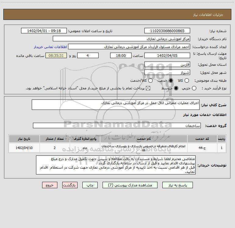 شرح کلی نیاز: اجرای عملیات عمرانی اتاق عمل در مرکز آموزشی درمانی نمازی