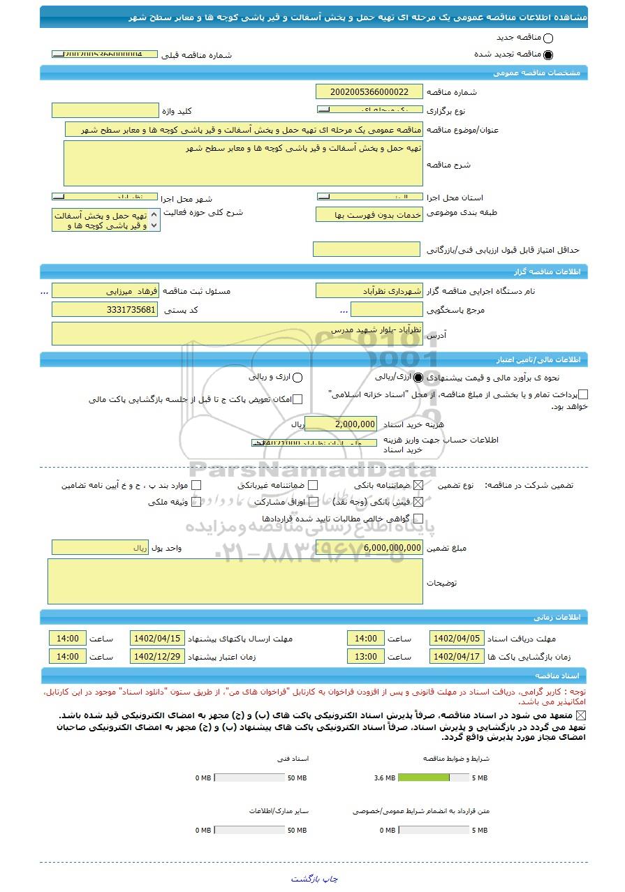| نام دستگاه اجرایی مناقصه گزار | شهرداری نظرآباد | مسئول ثبت مناقصه | فرهاد میرزایی |