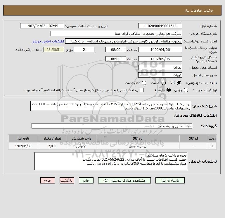 شرح کلی نیاز: روغن 1.5 لیتری سرخ کردنی - تعداد : 2000 بطر - کالای انتخاب شده صرفا جهت تشابه می باشد-لطفا قیمت پیشنهادی براساس2000بطر 1.5 لیتری باشد