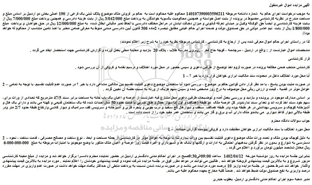 به موجب درخواست اجرای حکم به شماره دادنامه مربوطه 140107390003596211 محکوم علیه محکوم است به حکم بر فروش ملک موضوع پلاک ثبتی یک فرعی از 190 اصلی بخش دو اردبیل بر اساس مبلغ و مساحت مندرج در نظریه کارشناسی مضبوط در پرونده از بابت اصل خواسته و همچنین محکومیت بالسویه خواندگان به پرداخت مبلغ 3/042/000 ریال از بابت هزینه دادرسی و همچنین پرداخت مبلغ 7/000/000 ریال از بابت هزینه کارشناسی و ایضاً حق الوکاله وکیل بر مبنای تعرفه قانونی و میزان دخالت ایشان در مراحل مختلف دادرسی با لحاظ تمبر مالیاتی ابطال شده به مبلغ 12/000/000 ریال در حق خواهان و پرداخت مبلغ 1/800/000 ریال از بابت نیم عشر دولتی در حق صندوق دولت و ضمنا اجرای حکم غیابی مطابق تبصره 2ماده 306 قانون آیین دادرسی مدنی منوط به معرفی ضامن معتبر یا اخذ تامین متناسب از محکوم له خواهد بود//