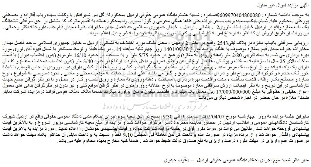 8 مزایده ملک 9810688 1404/08/15 new not special not payed اردبیل