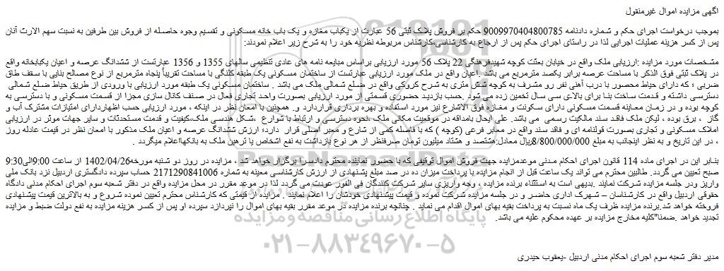 بموجب درخواست اجرای حکم و شماره دادنامه 9009970404800785 حکم بر فروش پلاک ثبتی 56 عبارت از یکباب مغازه و یک باب خانه مسکونی و تقسیم وجوه حاصله از فروش بین طرفین به نسبت سهم الارث آنان پس از کسر هزینه عملیات اجرایی لذا در راستای اجرای حکم پس از ارجاع به کارشناسی،کارشناس مربوطه نظریه خود را به شرح زیر اعلام نمودند: