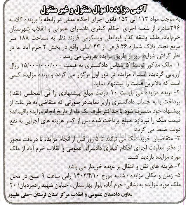 مزایده فروش ملک به مساحت 188 مترمربع تحت پلاک شماره 46 فرعی از 43 اصلی واقع در بخش 2 خرم آباد