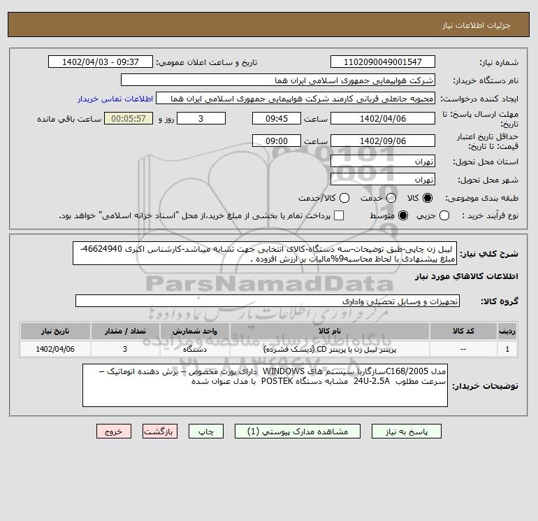 نام دستگاه خریدار:شرکت هواپیمایی جمهوری اسلامی ایران هما