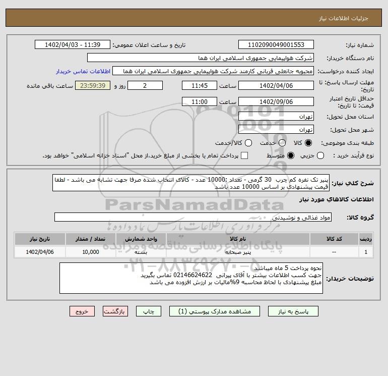 شرح کلی نیاز: پنیر تک نفره کم چرب 30 گرمی - تعداد :10000 عدد - کالای انتخاب شده صرفا جهت تشابه می باشد - لطفا قیمت پیشنهادی بر اساس 10000 عدد باشد