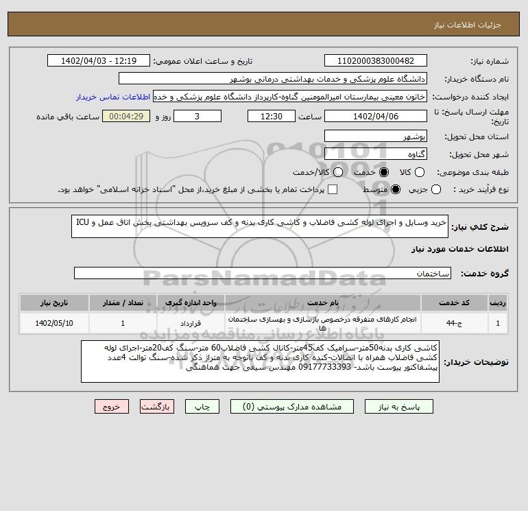 شرح کلی نیاز: خرید وسایل و اجرای لوله کشی فاضلاب و کاشی کاری بدنه و کف سرویس بهداشتی بخش اتاق عمل و ICU
