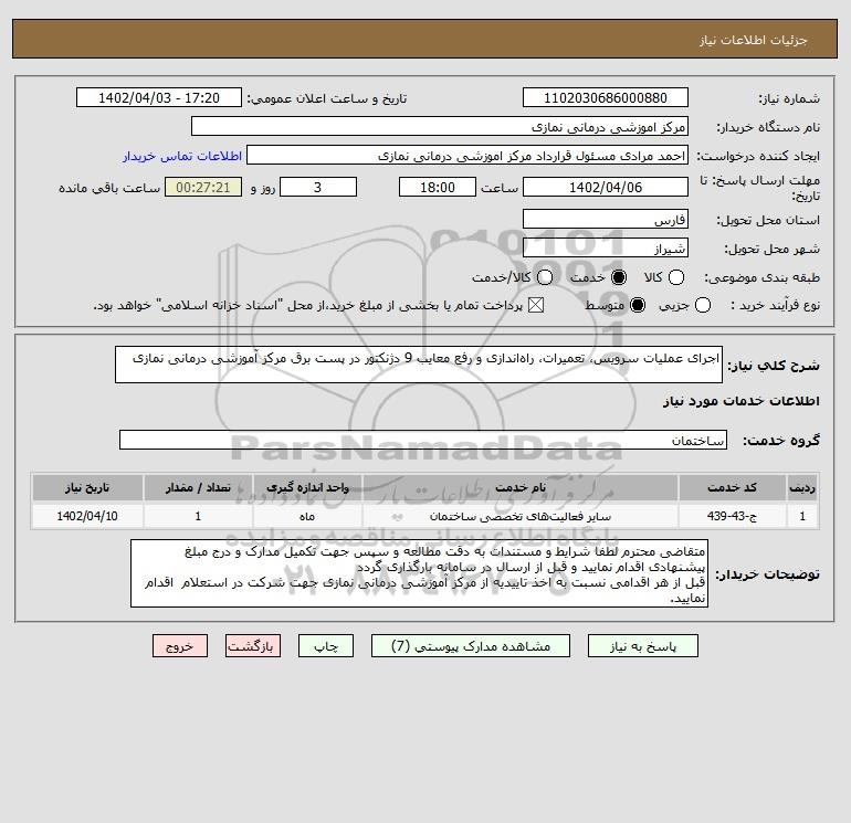 شرح کلی نیاز: اجرای عملیات سرویس، تعمیرات، راه اندازی و رفع معایب 9 دژنکتور در پست برق مرکز آموزشی درمانی نمازی