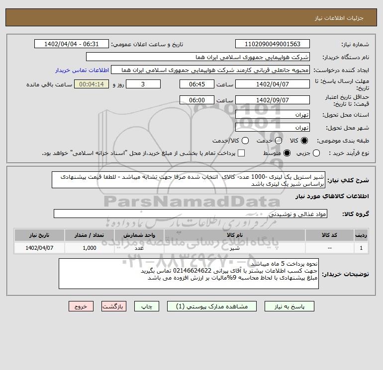 شرح کلی نیاز: شیر استریل یک لیتری -1000 عدد- کالای انتخاب شده صرفا جهت تشابه میباشد - للطفا قیمت پیشنهادی براساس شیر یک لیتری باشد