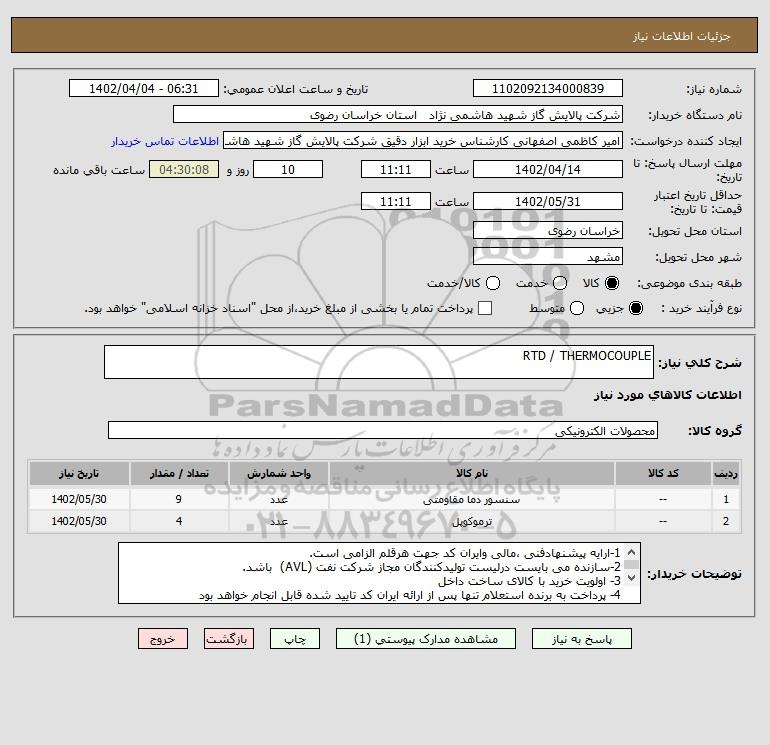 شرح کلی نیاز: RTD / THERMOCOUPLE