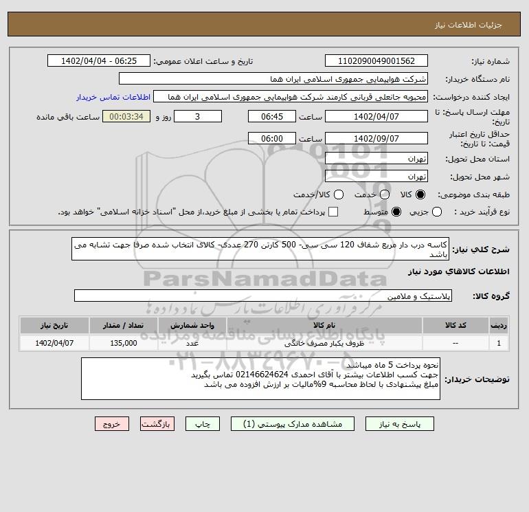 شرح کلی نیاز: کاسه درب دار مربع شفاف 120 سی سی- 500 کارتن 270 عددی- کالای انتخاب شده صرفا جهت تشابه می باشد