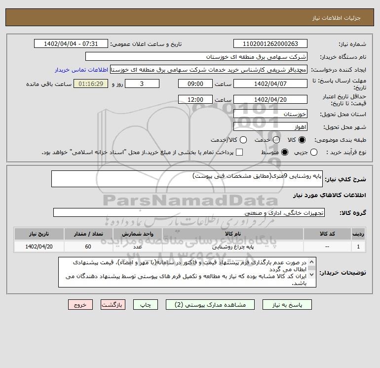 شرح کلی نیاز: پایه روشنایی 9متری(مطابق مشخصات فنی پیوست)