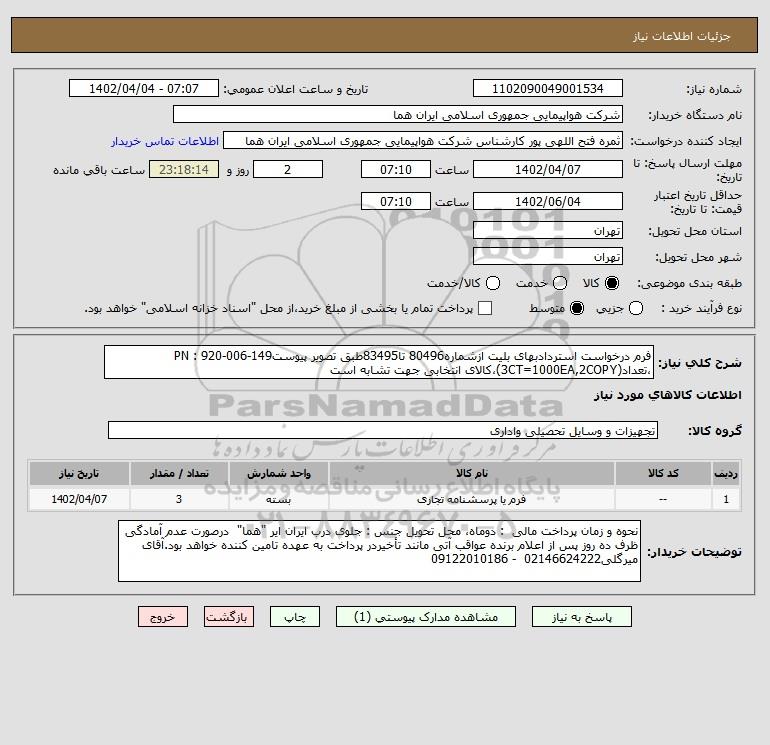 شرح کلی نیاز: فرم درخواست استردادبهای بلیت ازشماره80496 تا83495طبق تصویر پیوستPN : 920-006-149 ،تعداد(3CT=1000EA,2COPY)،کالای انتخابی جهت تشابه است