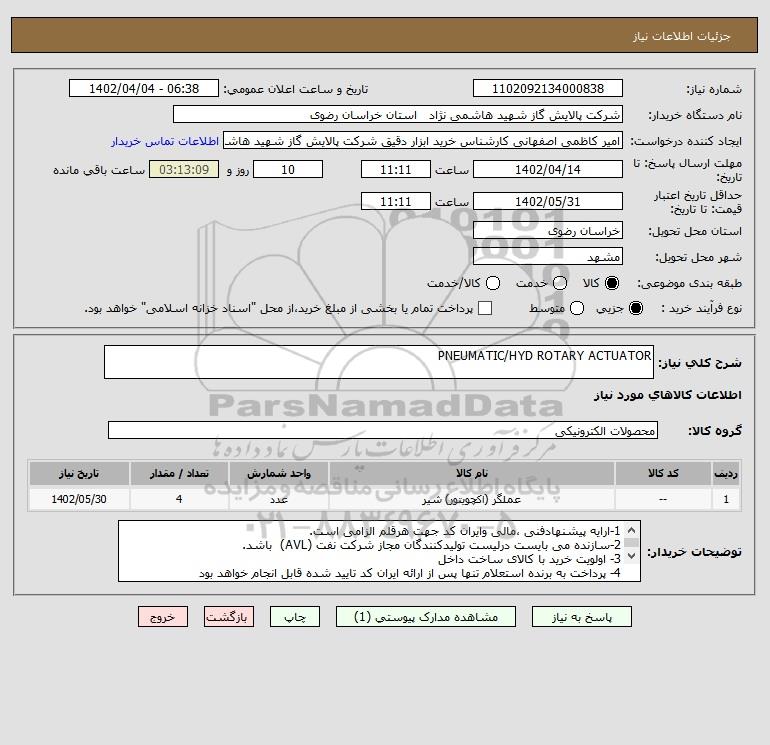 شرح کلی نیاز: PNEUMATIC/HYD ROTARY ACTUATOR