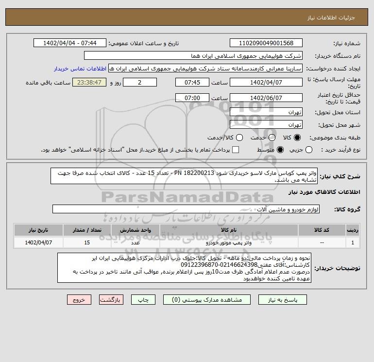 استعلام واتر پمپ کوباس مارک لاسو خریداری شود 182200213 PN - تعداد 15 عدد - کالای انتخاب شده صرفا جهت تشابه می باشد., استعلام واتر پمپ کوباس مارک لاسو خریداری شود 182200213 PN - تعداد 15 عدد - کالای انتخاب شده صرفا جهت تشابه می باشد.