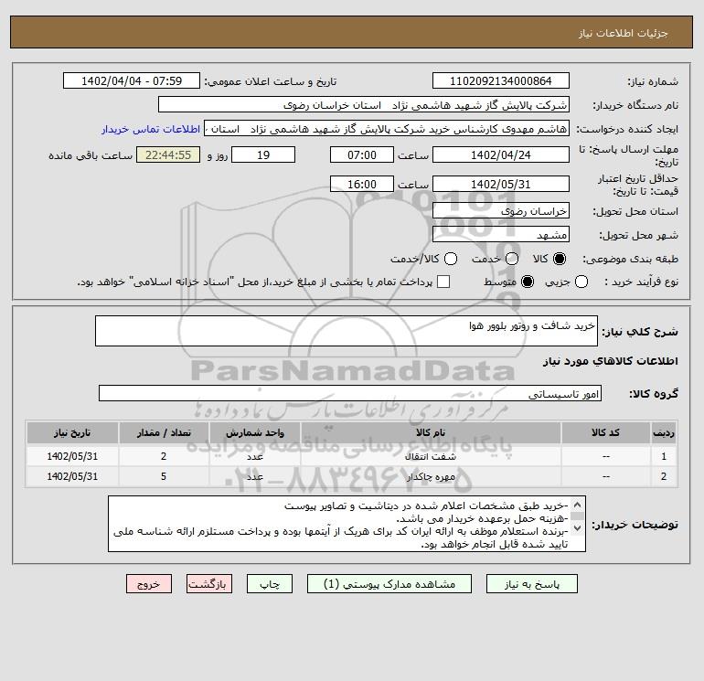 شرح کلی نیاز: خرید شافت و روتور بلوور هوا