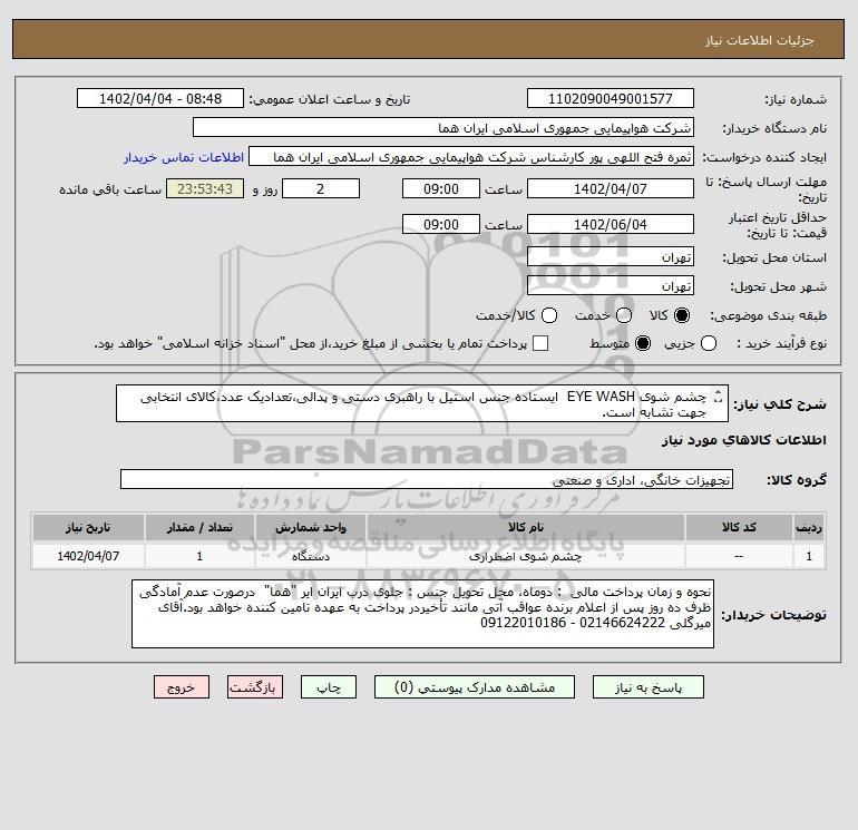 شرح کلی نیاز: چشم شوی EYE WASH ایستاده جنس استیل با راهبری دستی و پدالی،تعدادیک عدد،کالای انتخابی جهت تشابه است.