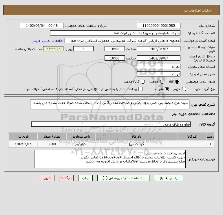 شرح کلی نیاز: سینه مرغ منجمد بی خس بدون چربی و ضایعات-مقدار:3 تن-کالای انتخاب شده صرفا جهت تشابه می باشد