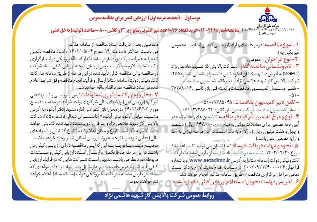 علاقهمندان میتوانند جهت دریافت اسناد و اطلاعات تکمیلی، تجدید ارزیابی کیفی مناقصه خرید 1076 عدد شیر کشویی با سامانه مناقصات و مزایدات ایران پارسنماد داده ها 88349670 تماس حاصل نمایند.