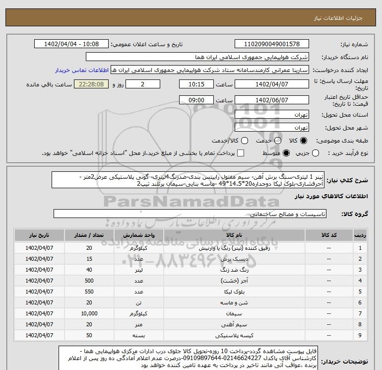 استعلام تینر 1 لیتری-سنگ برش آهن- سیم مفتول رابیتس بندی-ضدزنگ4لیتری- گونی پلاستیکی عرض2متر -آجرفشاری-بلوک لیکا دوجداره20*14.5*49 -ماسه بنایی-سیمان پرتلند تیپ2, استعلام تینر 1 لیتری-سنگ برش آهن- سیم مفتول رابیتس بندی-ضدزنگ4لیتری- گونی پلاستیکی عرض2متر -آجرفشاری-بلوک لیکا دوجداره20*14.5*49 -ماسه بنایی-سیمان پرتلند تیپ2