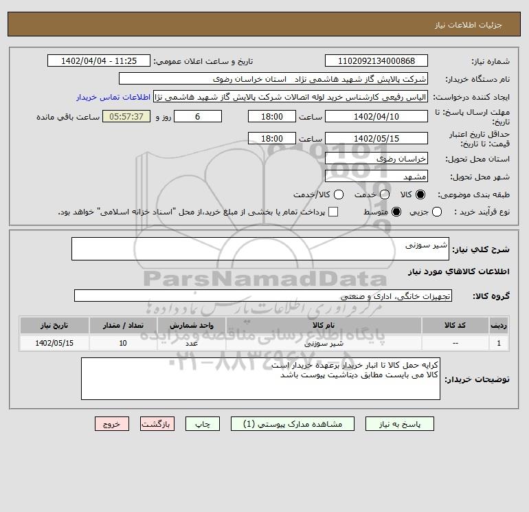 نام دستگاه خریدار:شرکت پالایش گاز شهید هاشمی نژاد استان خراسان رضوی