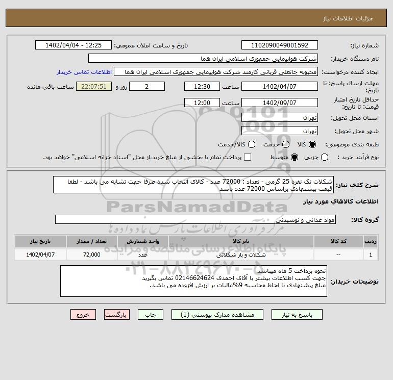 شرح کلی نیاز: شکلات تک نفره 25 گرمی - تعداد : 72000 عدد - کالای انتخاب شده صرفا جهت تشابه می باشد - لطفا قیمت پیشنهادی براساس 72000 عدد باشد