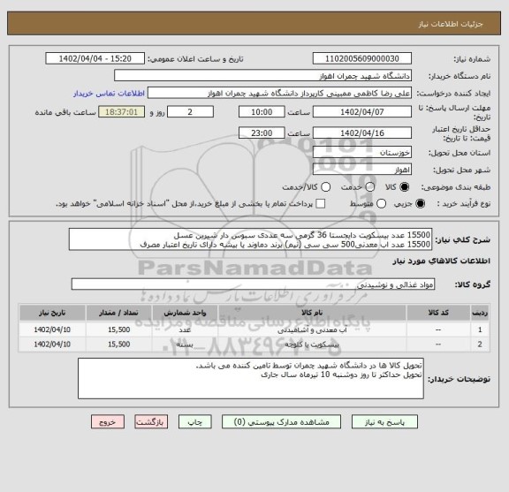 | 1 | -- | آب معدنی و آشامیدنی | عدد | 15,500 | 1402/04/10 |