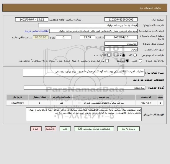 شرح کلی نیاز: عملیات اجرای کانال سنگی روستای کوه گندم بخش شهیون برابر برآورد پیوستی