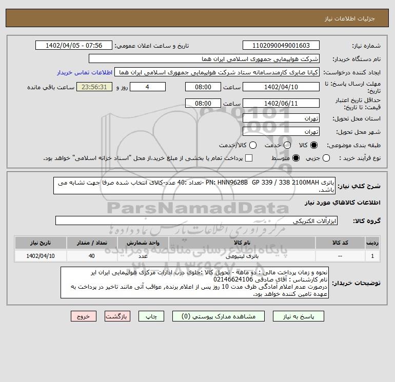 شرح کلی نیاز: باتری PN: HNN9628B GP 339 / 338 2100MAH -تعداد :40 عدد-کالای انتخاب شده صرفا جهت تشابه می باشد.