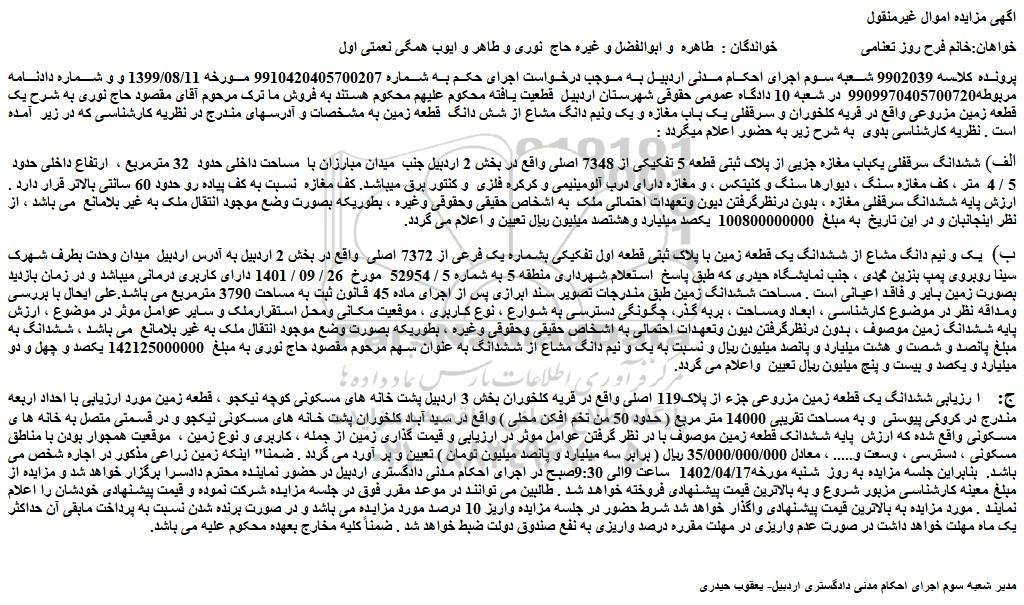 پرونده کلاسه 9902039 شعبه سوم اجرای احکام مدنی اردبیل به موجب درخواست اجرای حکم به شماره 9910420405700207 مورخه 1399/08/11 و و شماره دادنامه مربوطه9909970405700720 در شعبه 10 دادگاه عمومی حقوقی شهرستان اردبیل قطعیت یافته محکوم علیهم محکوم هستند به فروش ما ترک مرحوم آقای مقصود حاج نوری به شرح یک قطعه زمین مزروعی واقع در قریه کلخوران و سرقفلی یک باب مغازه و یک ونیم دانگ مشاع از شش دانگ قطعه زمین به مشخصات و آدرسهای مندرج در نظریه کارشناسی که در زیر آمده است . نظریه کارشناسی بدوی به شرح زیر به حضور اعلام میگردد :