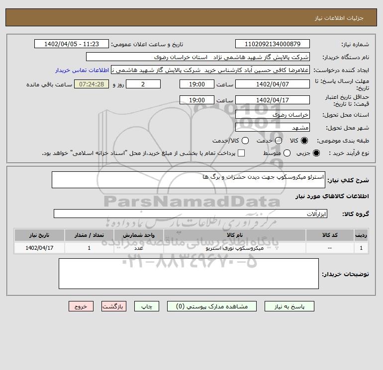 نام دستگاه خریدار:شرکت پالایش گاز شهید هاشمی نژاد استان خراسان رضوی