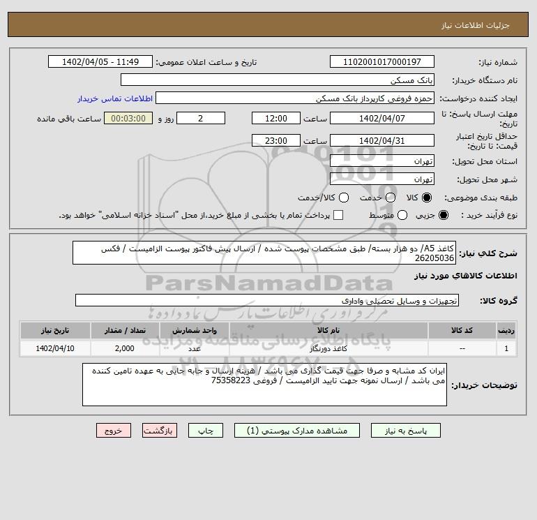 شرح کلی نیاز: کاغذ A5/ دو هزار بسته/ طبق مشخصات پیوست شده / ارسال پیش فاکتور پیوست الزامیست / فکس 26205036