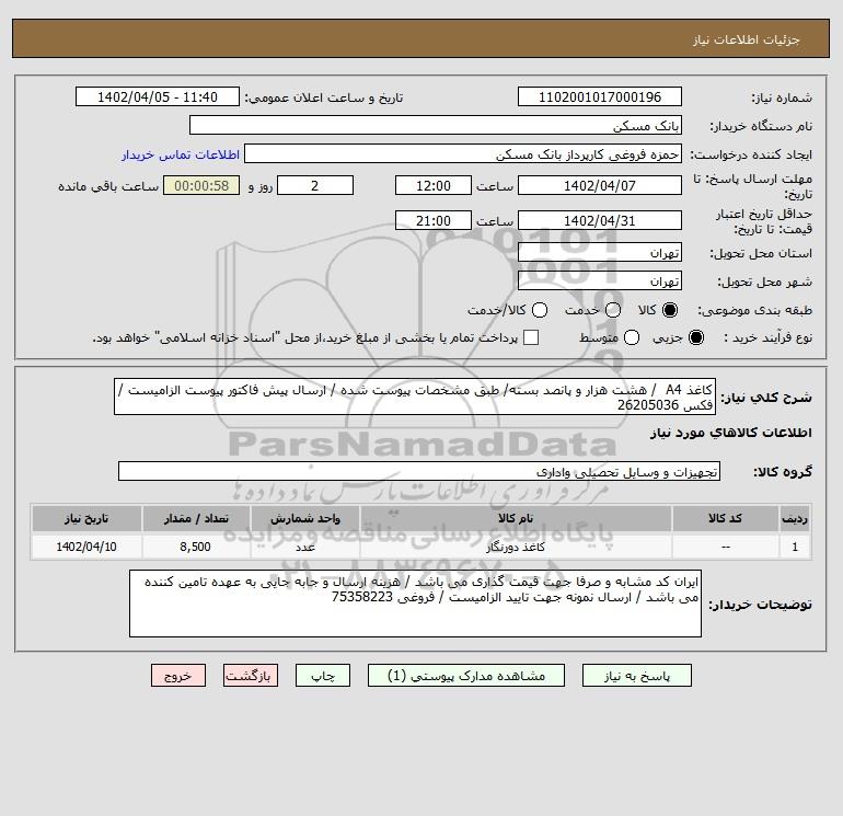 شرح کلی نیاز: کاغذ A4 / هشت هزار و پانصد بسته/ طبق مشخصات پیوست شده / ارسال پیش فاکتور پیوست الزامیست / فکس 26205036