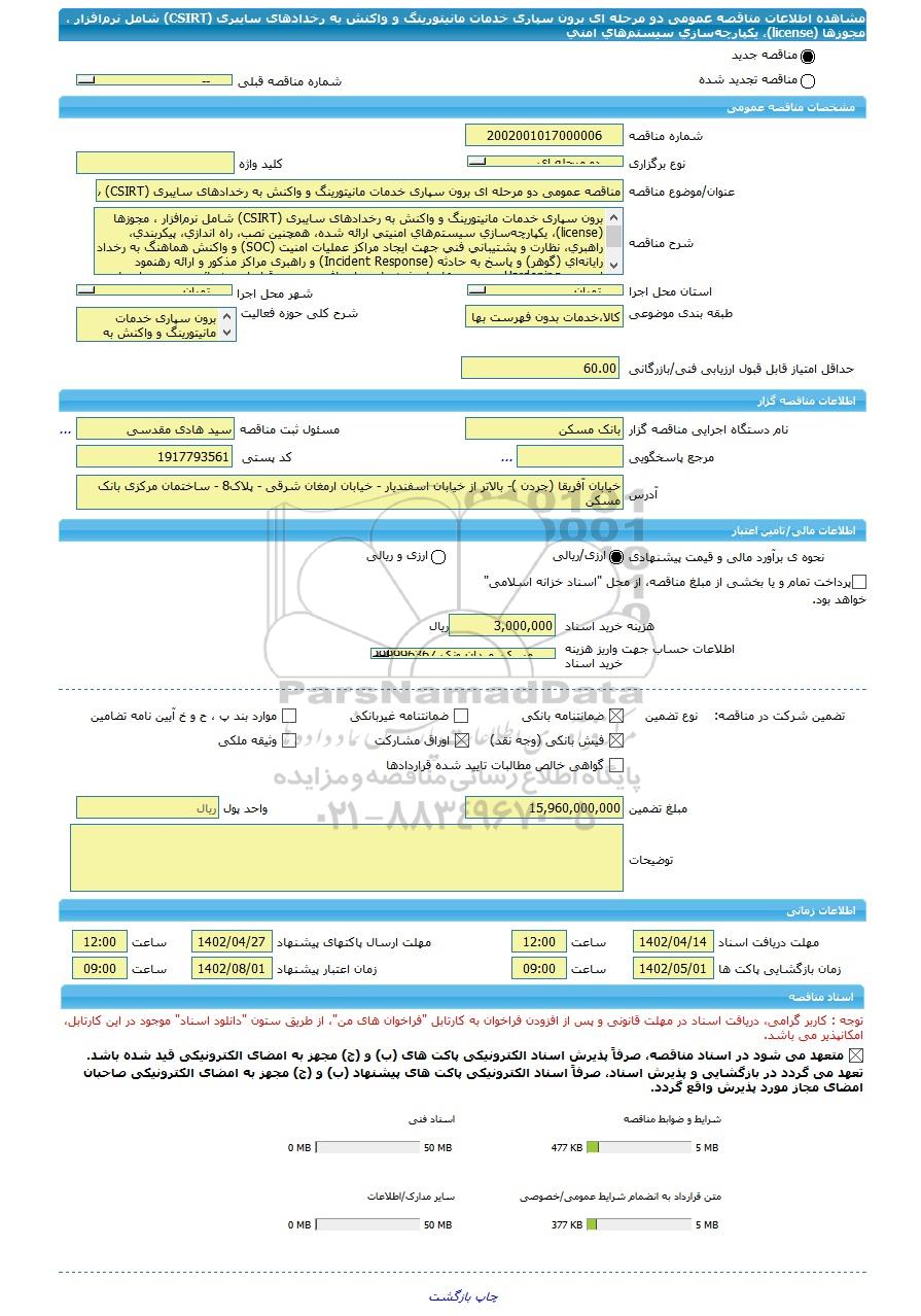 عنوان/موضوع مناقصهمناقصه عمومی دو مرحله ای برون سپاری خدمات مانیتورینگ و واکنش به رخدادهای سایبری (CSIRT) شامل نرم‌افزار ، مجوزها (license)، یکپارچه‌سازی سیستم‌های امنی