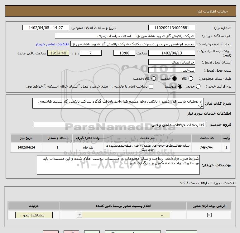 نام دستگاه خریدار:شرکت پالایش گاز شهید هاشمی نژاد استان خراسان رضوی