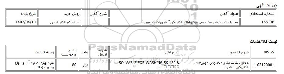 | 156136 | محلول شستشو مخصوص موتورهای الکتریکی" شهران شیمی " | استعلام الکترونیکی | 1402/04/10 |