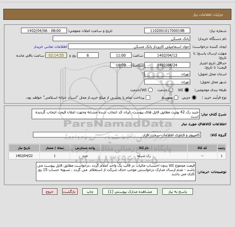 شرح کلی نیاز: خرید رک 42 یونیت مطابق فایل های پیوست، ایران کد انتخاب شده مشابه وجهت اعلان قیمت انتخاب گردیده است