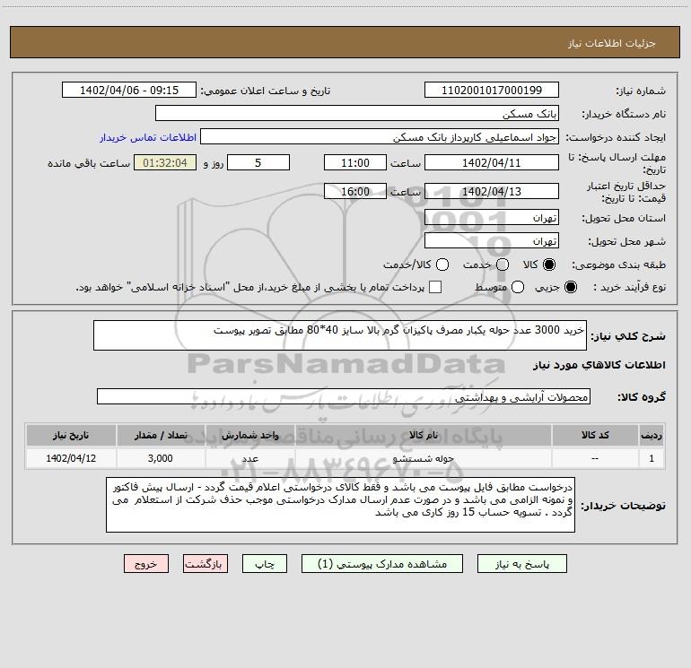 شرح کلی نیاز: خرید 3000 عدد حوله یکبار مصرف پاکیزان گرم بالا سایز 40*80 مطابق تصویر پیوست
