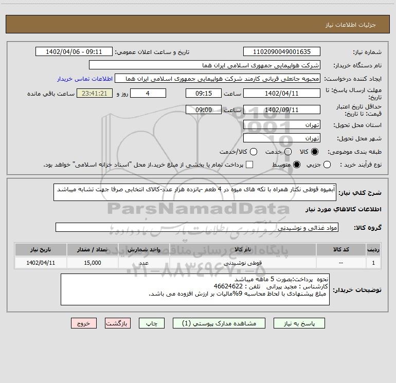 استعلام آبمیوه قوطی نکتار همراه با تکه های میوه در 4 طعم -پانزده هزار عدد-کالای انتخابی صرفا جهت تشابه میباشد, استعلام آبمیوه قوطی نکتار همراه با تکه های میوه در 4 طعم -پانزده هزار عدد-کالای انتخابی صرفا جهت تشابه میباشد