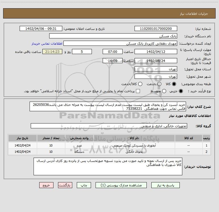 استعلام خرید آبسرد کن و یخچال طبق لیست پیوست عدم ارسال لیست پیوست به منزله حذف می باشد26205036 فکس تماس جهت هماهنگی 75358221, استعلام خرید آبسرد کن و یخچال طبق لیست پیوست عدم ارسال لیست پیوست به منزله حذف می باشد26205036 فکس تماس جهت هماهنگی 75358221
