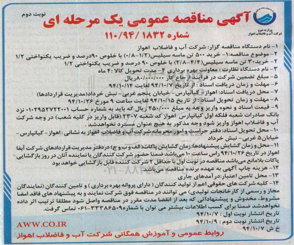 آگهی مناقصه عمومی یک مرحله ای خرید 500 تن ماسه سیلیس نوبت دوم از کلیه افراد متخصص و شرکتها واجد شرایط دعوت به عمل میآید در مناقصه با کد خبرگزاری پارس نماد: 601167 شرکت نمایند.