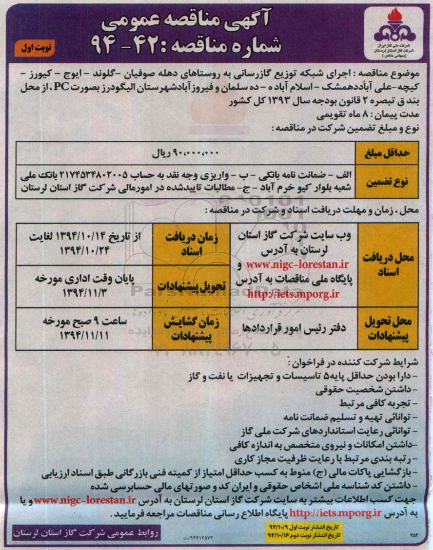 موضوع مناقصه: اجرای شبکه توزیع گازرسانی به روستاهای دهله صوفیان- گلوند- ایوج- کیورز- کیچه - علی آباد دهمشک- اسلام آباده- ده سلمان و فیروز آباد شهرستان الیگودرز به صورت PC، از محل بند ق تبصره 2 قانون بودجه 1393 کل کشور