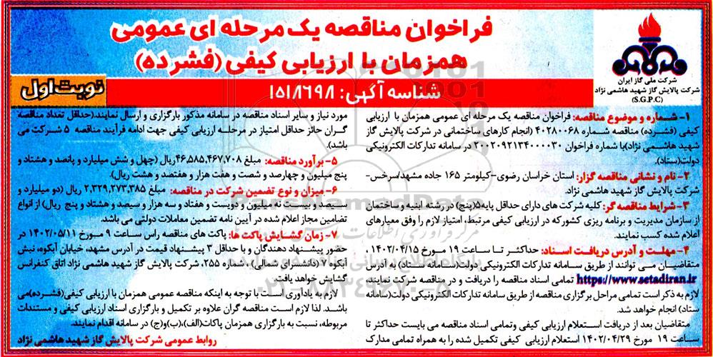 شماره موضوع مناقصه: فراخوان مناقصه یک مرحله ای عمومی همزمان با ارزیابی کیفی فشرده مناقصه شماره 40280068 (انجام کارهای ساختمانی در شرکت پالایش گاز شهید هاشمی نژاد) با شماره فراخوان 2002092134000030 در سامانه تدارکات الکترونیکی دولت ستاد