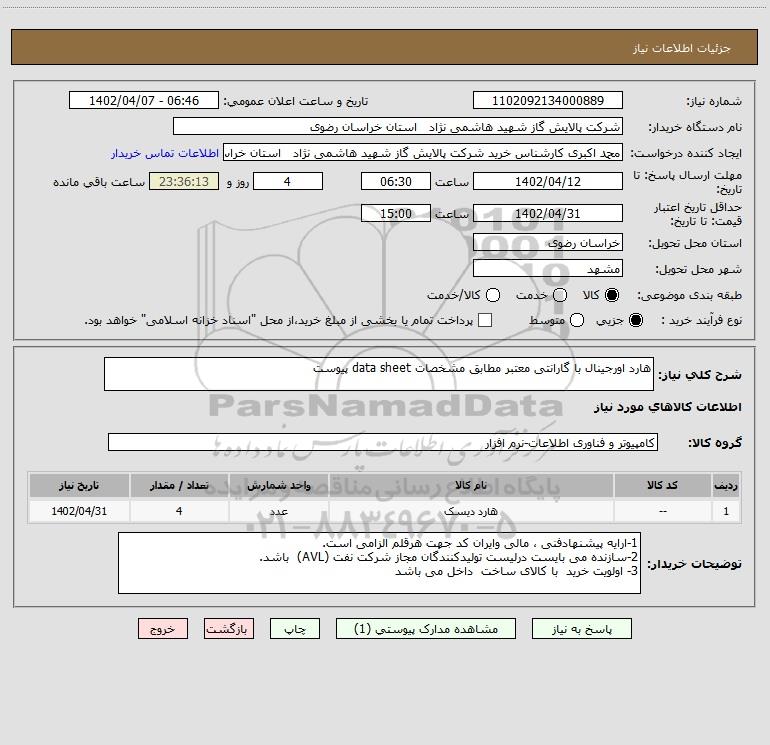 نام دستگاه خریدار:شرکت پالایش گاز شهید هاشمی نژاد استان خراسان رضوی